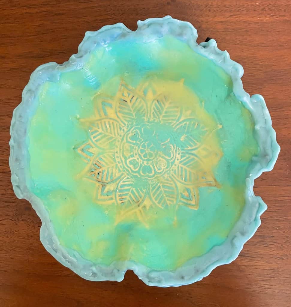 Encaustic Vessel – Sculptural Bowl made with Creative Paper Clay. Features a stamp design inside and accretion texture on the outside Diameter ~7 inches x Height 1.25 inches